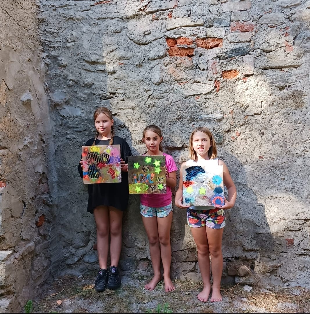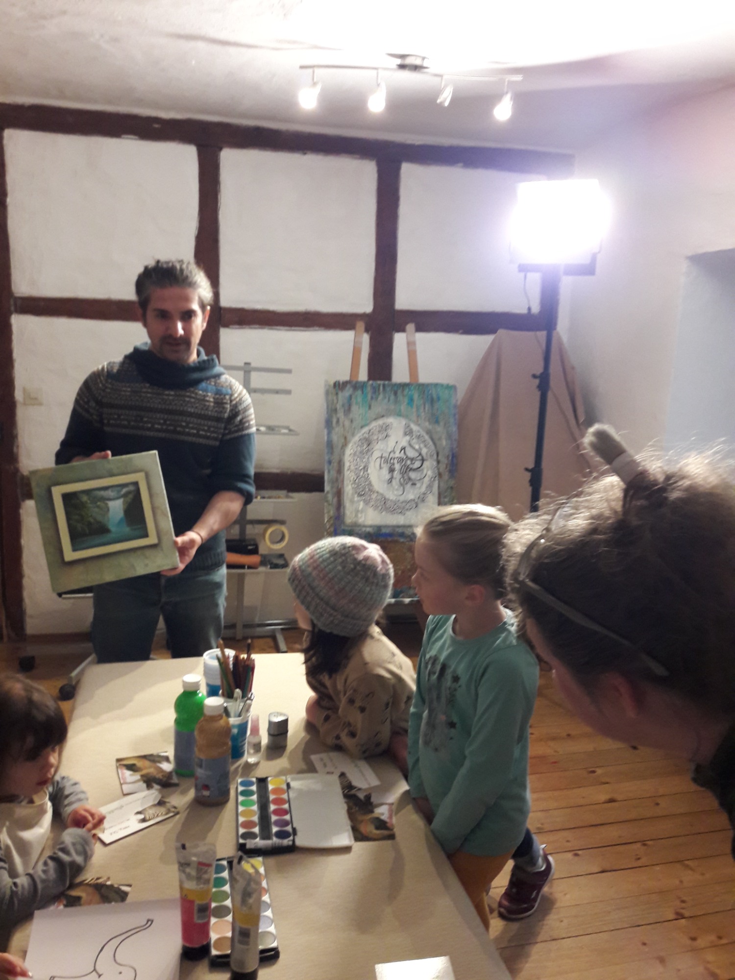 Der Kunstworkshop vom Sommerferienprogramm 2023 am 18.8. von 10 bis 18 Uhr im Atelier Ayne mit Stella und Ibrahim war sehr ereignisreich und ein voller Erfolg. Drei Mädels haben an dem Workshop teilgenommen. Begonnen haben wir mit einem Kennenlernkreis, bei dem jeder seinen Namen mit einem dazu passenden Adjektiv und einer künstlerischen Bewegung vorgestellt hat. Aus vielen Postkarten, die ums Atelier herum ausgelegt wurden, durfte jede Teilnehmerin zwei Postkarten auswählen, die etwas mit ihr zu tun hatten und so lernten wir uns zu Beginn schon etwas besser kennen. Jeder hörte aufmerksam zu und war neugierig auf jede einzelne Anekdote aus dem Leben.