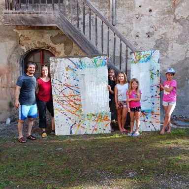 Der Malprozess war intuitiv und spielerisch, nicht auf ein bestimmtes Ziel ausgerichtet. Die Dynamik, Energie und Spontanität des Malprozesses sind in den Werken zu sehen und zu spüren. Abstrakte Bilder entstanden nach sieben Stunden in angenehmer Atmosphäre, bezaubernder Umgebung und vielen bunten Farben.