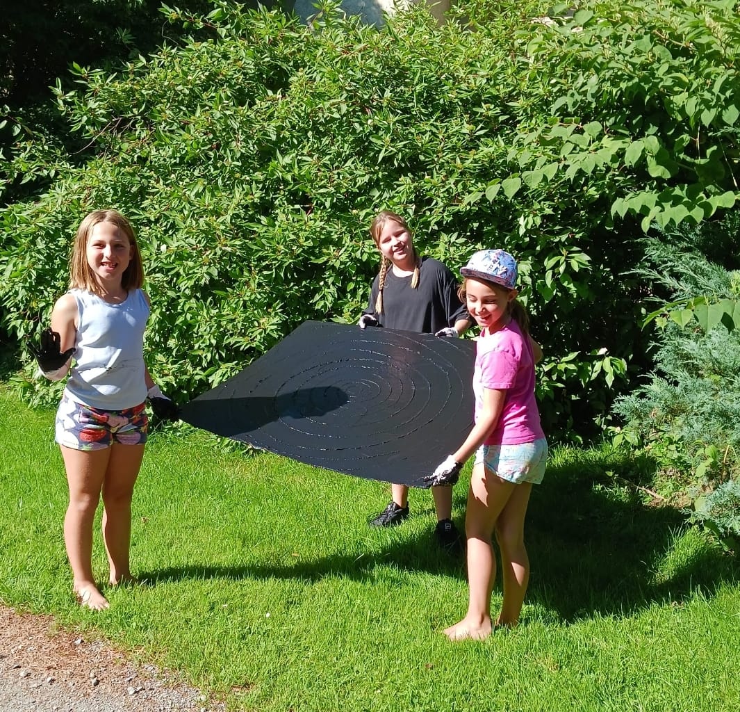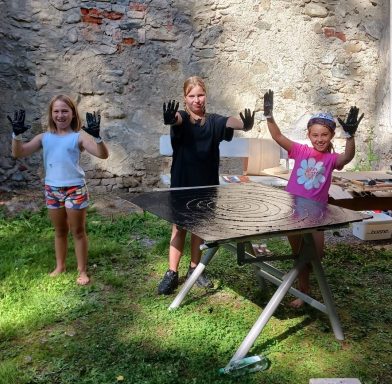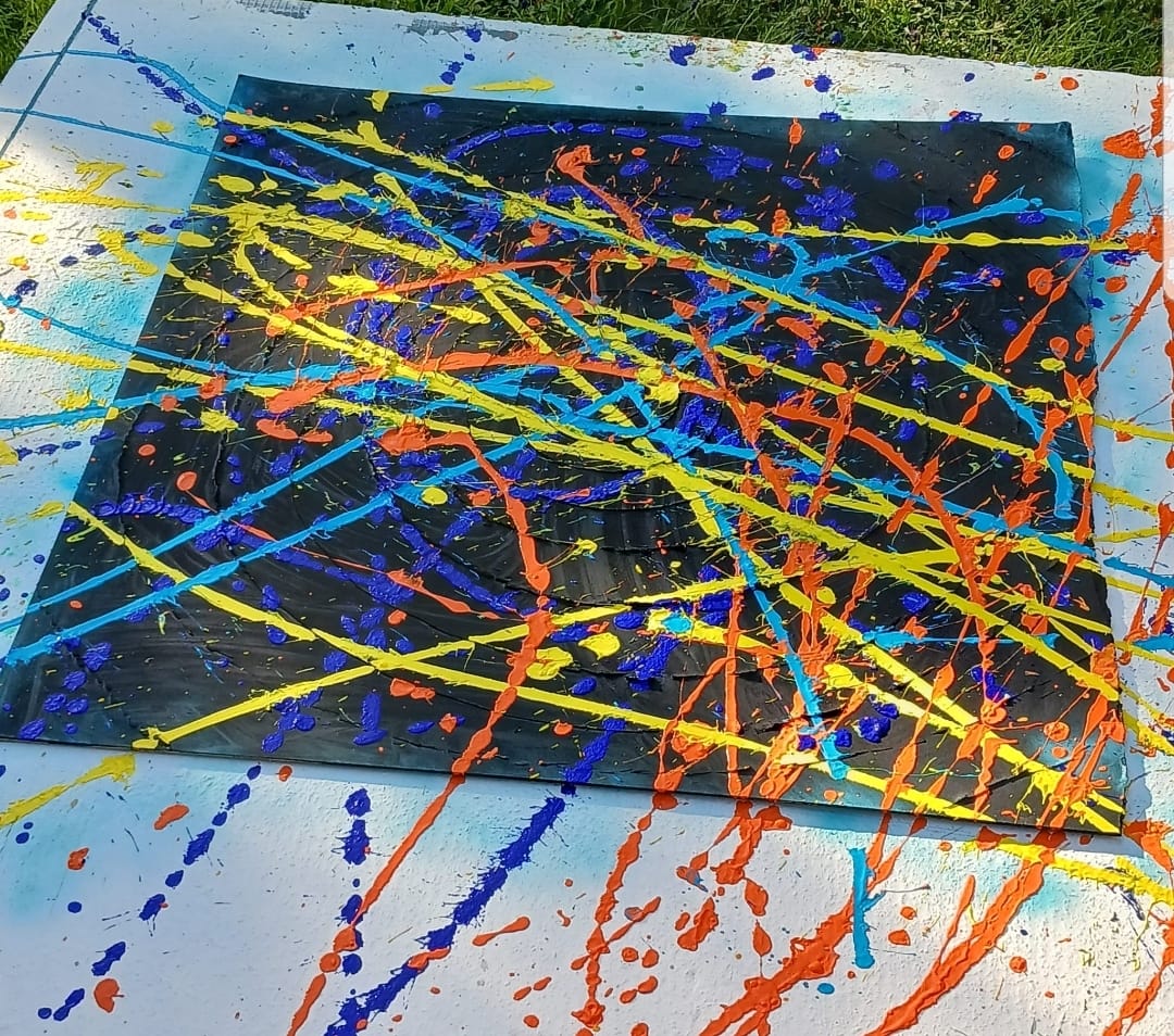 Am Schluss arbeiteten wir an einem Gemeinschaftswerk, eine Spirale wurde auf einer großen Holzfaserplatte eingemeißelt. Dann mit schwarzer Farbe eingerieben. Es machte jede Menge Spaß die schwarze Masse mit den Händen zu verteilen. Nachdem die Sonne beim Trocknen geholfen hatte, ging es weiter, mit viel Freude wurden Farbflaschen über das Bild gespritzt, mit Sand bestreut, darüber gelaufen und zuletzt mit einem Wasserschlauch abgespritzt. Erstaunlich, wie sich das Bild immer wieder von einer anderen Seite zeigte. Mit der Power, die in uns steckt, wurde das Werk mit starkem Ausdruck erschaffen. Wir haben uns die Freiheit genommen, die Dinge mal anders darzustellen und in kunterbunte Farbe einzutauchen. So entstand ein ganz individuelles Kunstwerk.