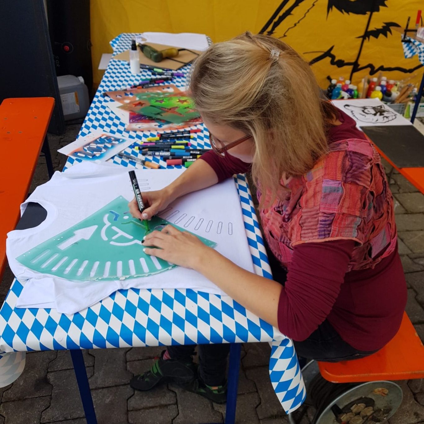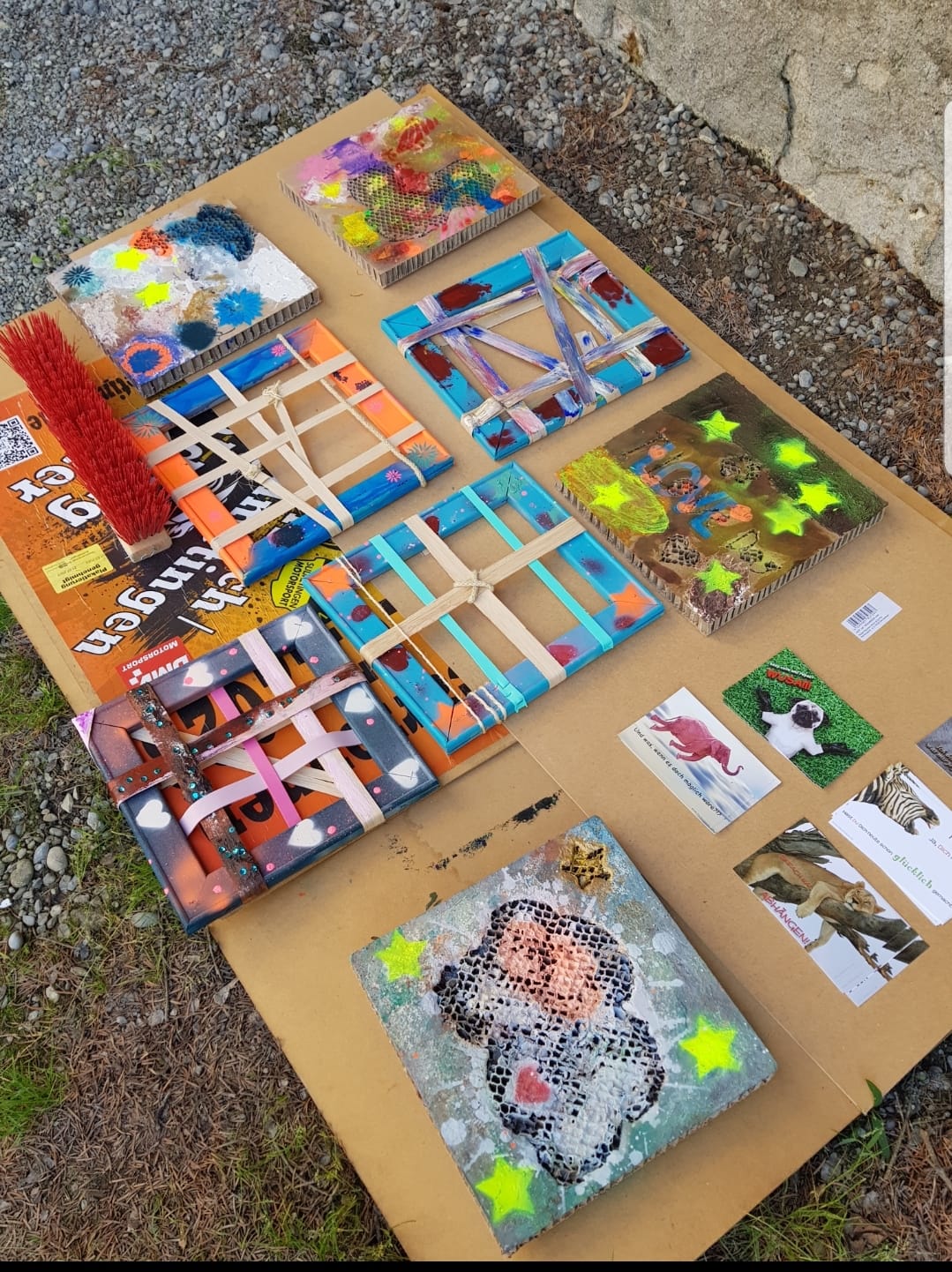 Das erste Experimentieren begann mit einem Kunstwerk auf Pappe. Dazu wurde ein eigenes Motiv ausgewählt oder frei improvisiert auf die Oberfläche aufgemalt und dann mit einem Meißel rausgestanzt. Verschiedene Massen wurden angerührt mit Farben und Graffiti Spray verziert und am Ende entstanden ganz unterschiedliche Werke, die zu den Künstlerinnen passten und ihre Herzensangelegenheiten darstellten.